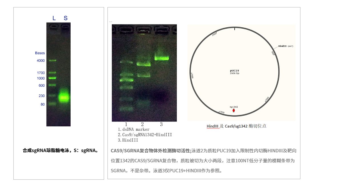 請指定靶向DNA序列的20個堿基,艾基生物提供對應的sgRNA。sgRNA合成采用體外轉錄法,具有生物相容性好、純度高、活性高的優點,并且可以擴大到g級合成。一次反應可獲得>100ug sgRNA。合成周期3個工作日。